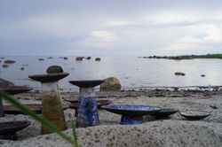 Ткани подсвечивались солнцем, надувались, как паруса, ветром, жили вместе с окружающей их красотой. Вот и решили художники поделиться этой радостью со всеми, кто добредёт до Школьной губы. Вдоль дороги протянули ниточку Ариадны, выложили камушки со стрелками. Весело было идти по этой дорожке, будто ты нечаянно забрёл в детство. Батики развесили и разложили прямо на траве и камнях. Гостей угощали чаем с пирогами. Вели неспешные разговоры. И здесь же, пристроившись на вынесенных морем брёвнах, учились у художников делать красоту из простых камней, что были под ногами.